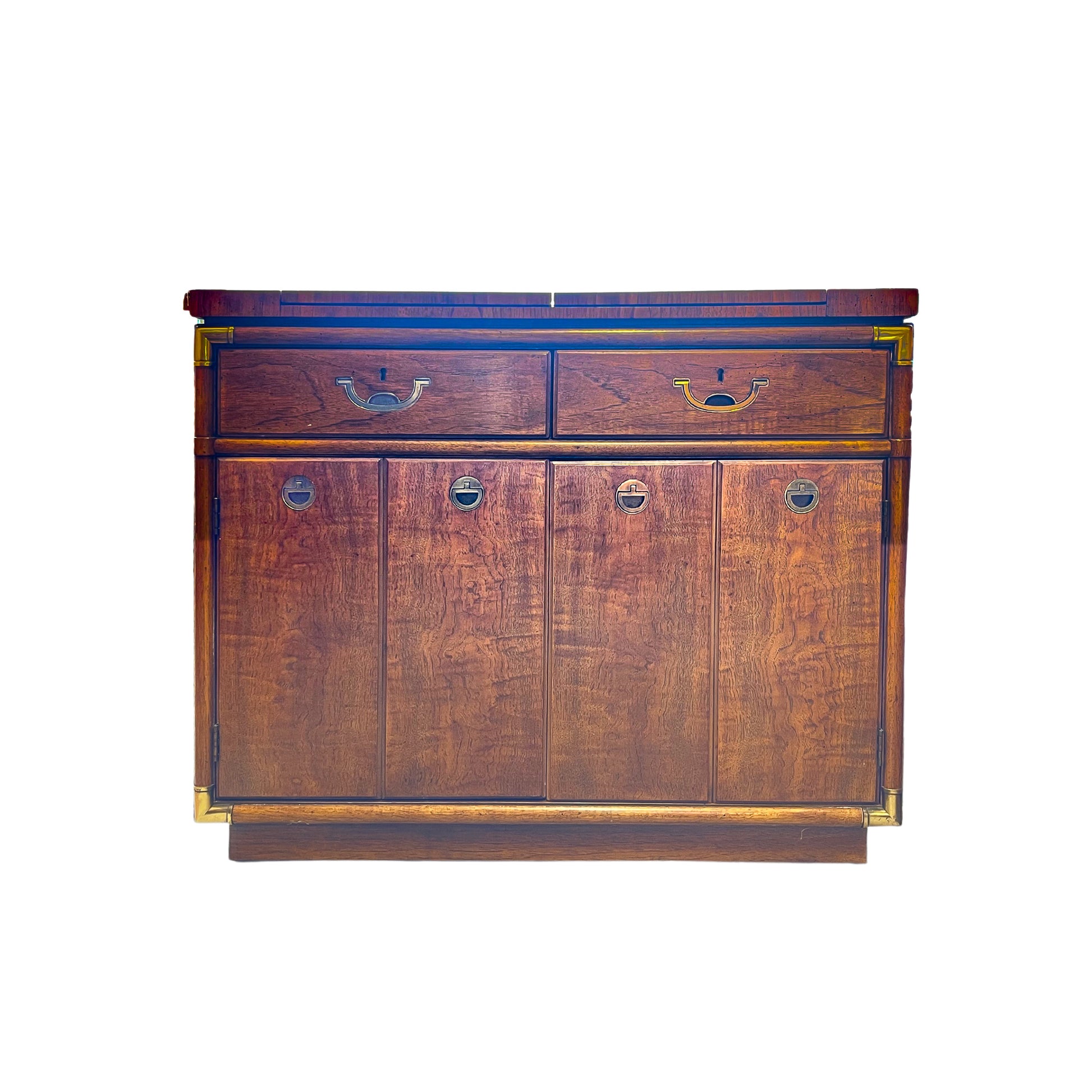 Brogan is a Drexel campaign flip top bar / server. Finished in our high gloss 2k lacquer. The interior is in a contrast color, Submerged by Curator. The original brass hardware has been polished and sealed. New casters have been added to assist with moving the piece. The back is completely finished so this piece can be positioned facing out for entertaining.