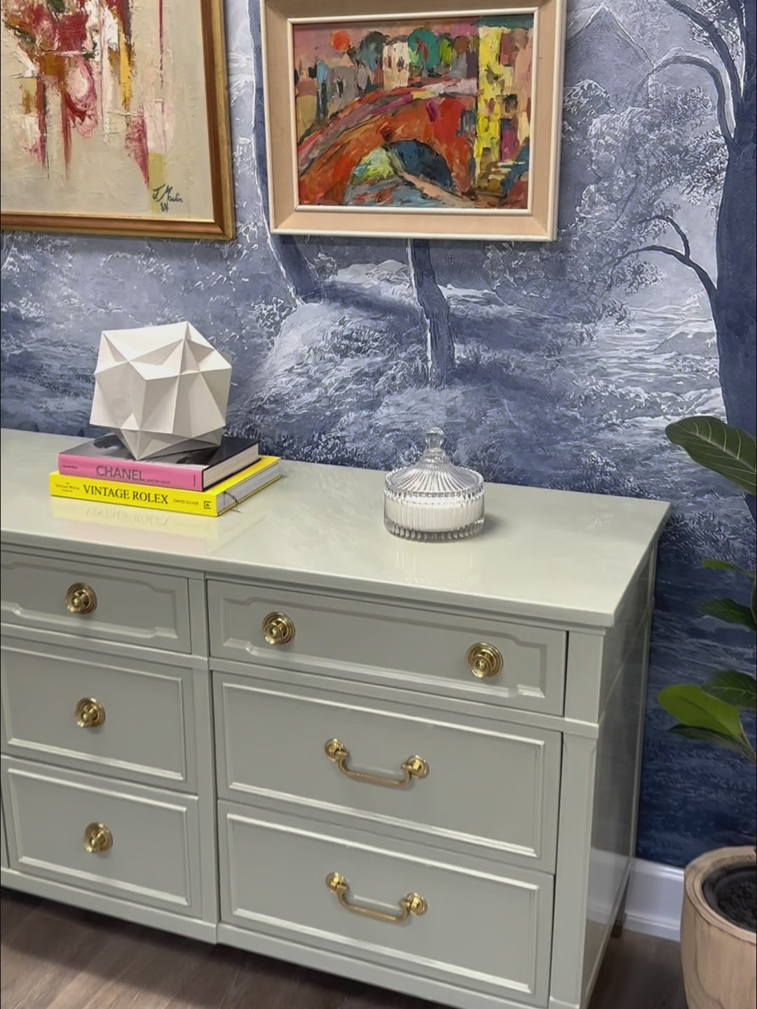 Meet Davidson, a versatile lowboy dresser from Drexel. He can also serve as a sideboard, credenza, or buffet. Finished in a subtle green, he retains his original hardware, with a special touch of brass at the feet. Truly timeless!