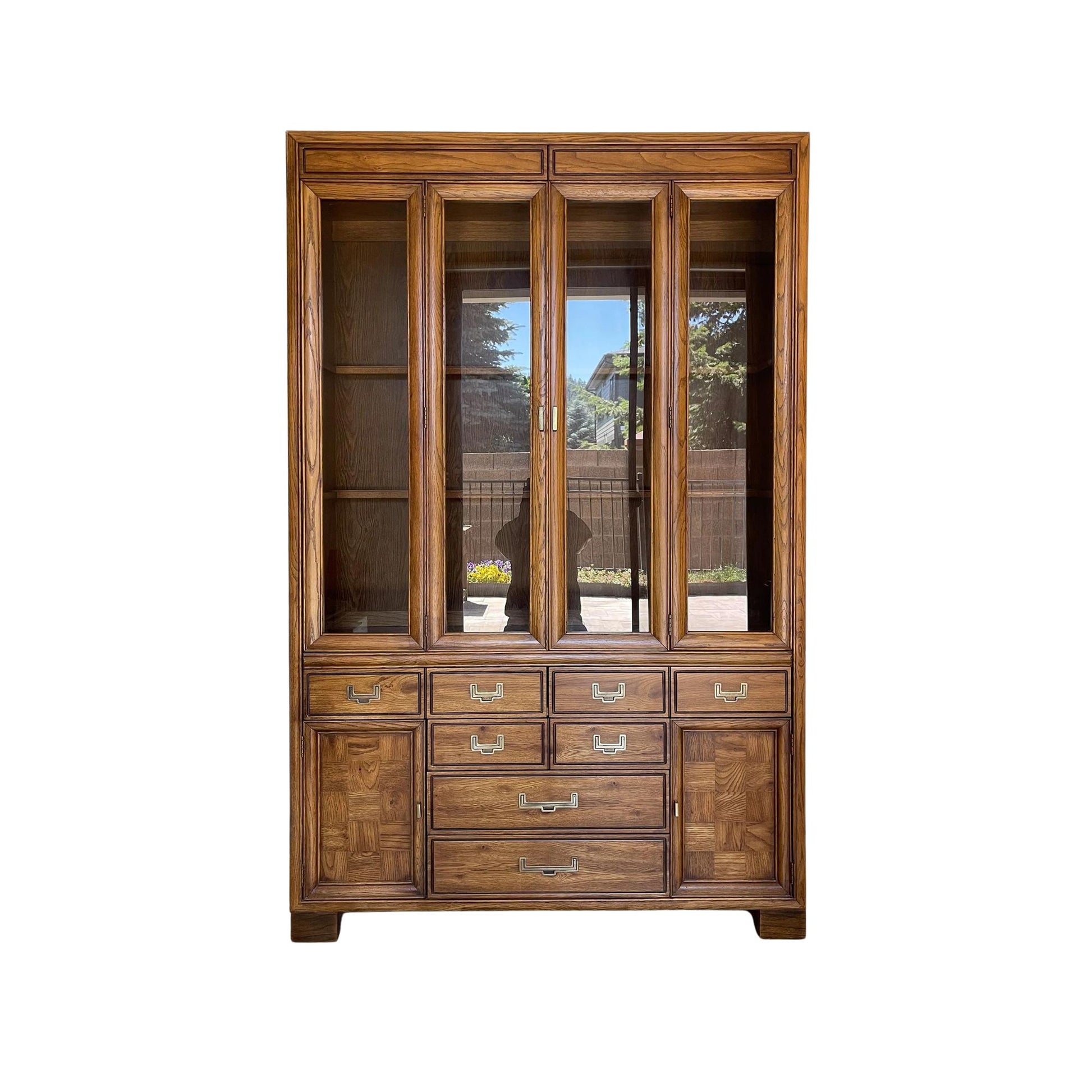 Delaney is a grand campaign style hutch from Stanley. Freshly lacquered in a glorious high gloss deep green. Three wide and clean drawers and two generous cabinet areas below. Ready to be reclaimed!