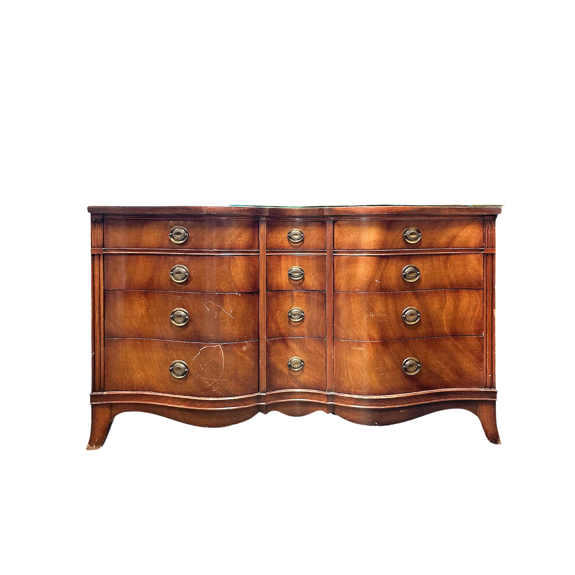 Diana is a vintage Drexel double bowfront lowboy dresser. Her gorgeous curves are accentuated by our high gloss lacquer finish. She will add a touch of sophistication to any bedroom. All the drawers are lined with a blue and copper Thibault grasscloth paper. New brass tassel pulls, and knobs add to Diana's elegance. The original glass top (not pictured yet) has been preserved and comes with Diana.
