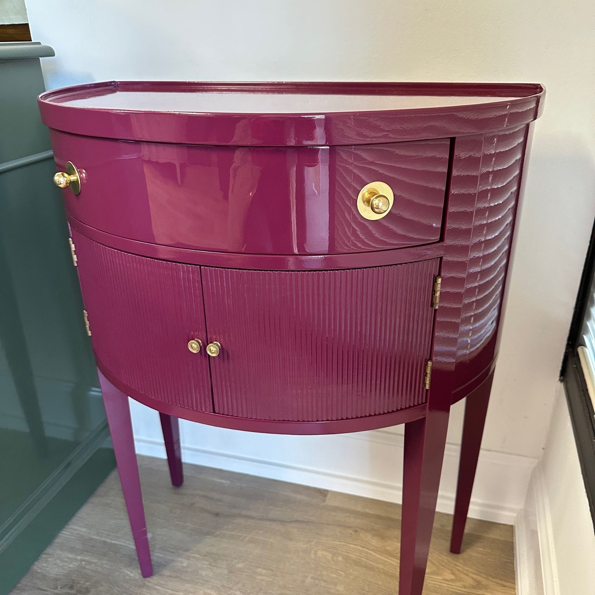 Reagan may be half-moon in shape, but she’s full of charm. With her demi-lune silhouette and long elegant legs, Reagan is the kind of side table that knows how to keep things classic—without trying too hard. She comes with her original glass top (yes, she’s that put-together) and a surprisingly roomy drawer and cabinet for stashing anything from cocktail napkins to love notes you meant to throw away.