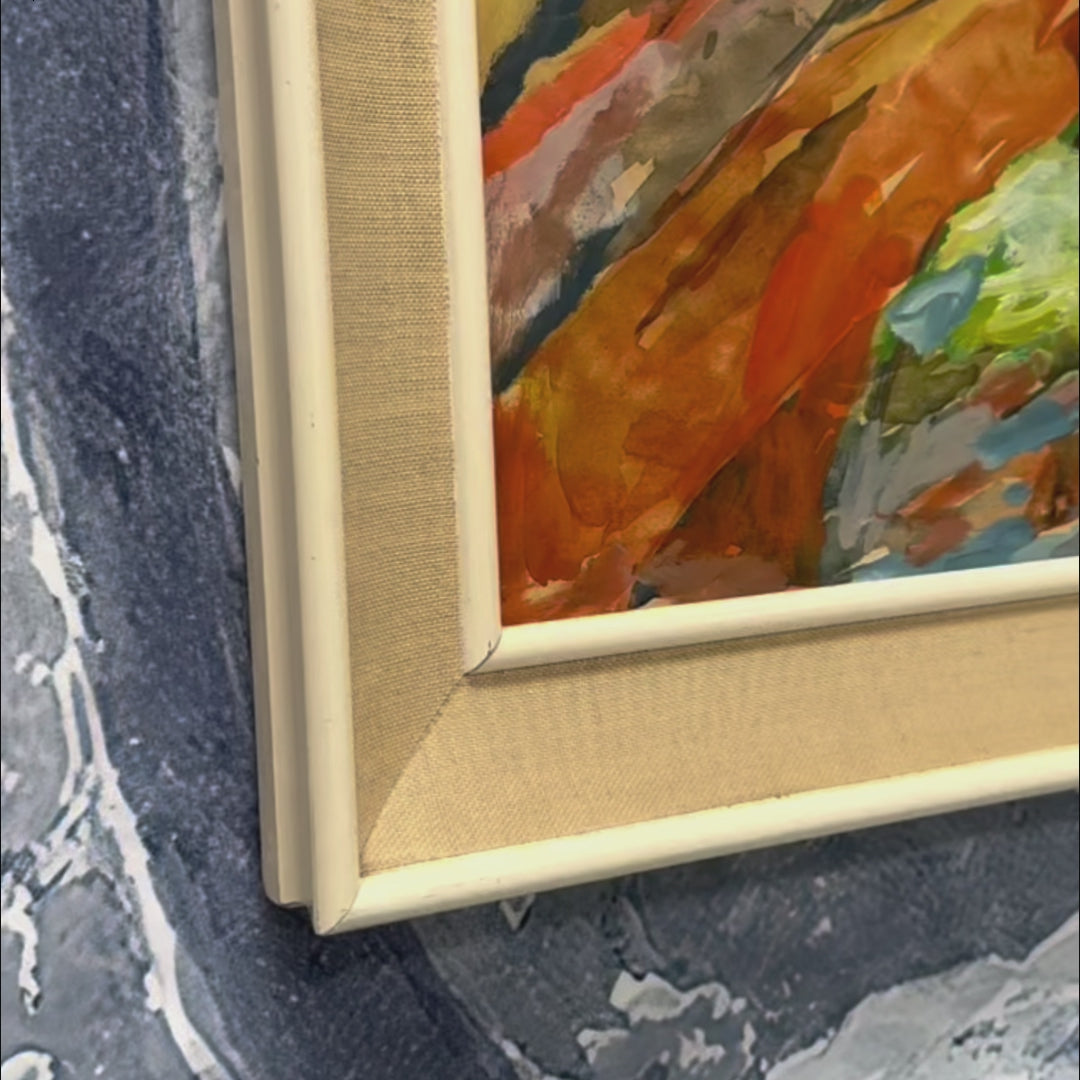 This is an original abstract impressionist painting, most likely done with gouache. It features a fantastic abstraction of a bridge and surrounding scene. Very colorful and beautifully framed.