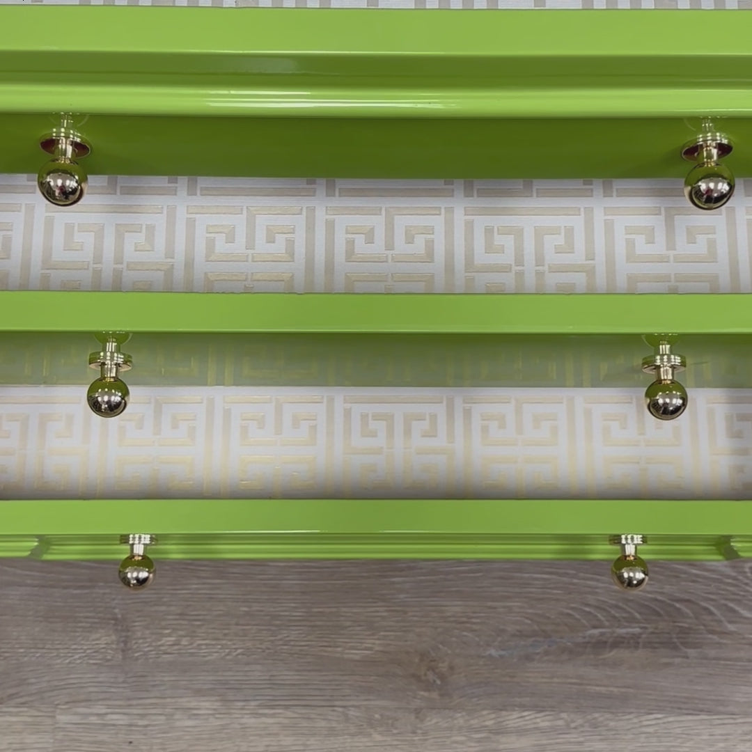 Beautiful, classic John Widdicomb set of twin headboards with a matching nightstand to use between, a classic guest room or kids' room configuration. Back in the 1950s, we imagine the Walshes were the centerpiece of a vibrant, bustling kids’ room. The two twin headboards stood proudly, surviving kids jumping on the bed as siblings played pretend or giggled into the night. Finished in a soft green lacquer, the set was the perfect backdrop for childhood memories—bright, fresh, and full of fun. The nightstand, with its new brass hardware and drawers lined with gold and cream Greek key wallpaper, can now be the keeper of treasures—lost marbles, hand-drawn notes, and maybe even a secret stash of candy. The Walsh Set is ready to bring that same charm and playful spirit to your home.